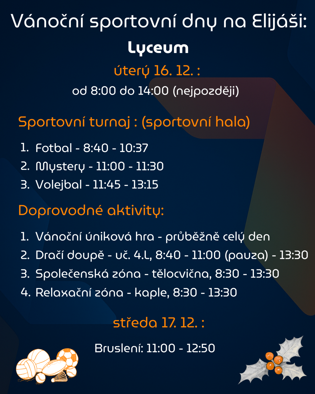 V úterý 16. 12. se koná vánoční sportovní den, v jehož rámci proběhne turnaj ve volejbale a fotbale, ale též úniková hra, strategické a společenské hry a mystery...